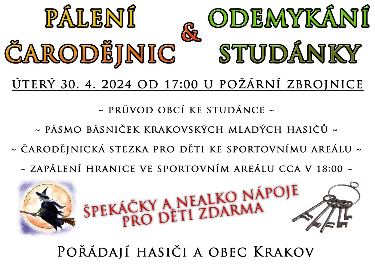 Hasiči a obec Krakov vás zvou na Odemykání studánky a pálení čarodějnic, které se konají v úterý 30.4.2024 od 17.00 hodin.